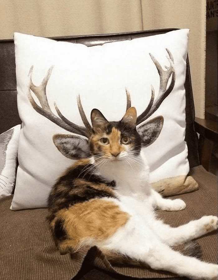 A cat poses at the exact spot where an object behind it looks like a pair of horns. Cute, clever, and unintentionally mischievous.