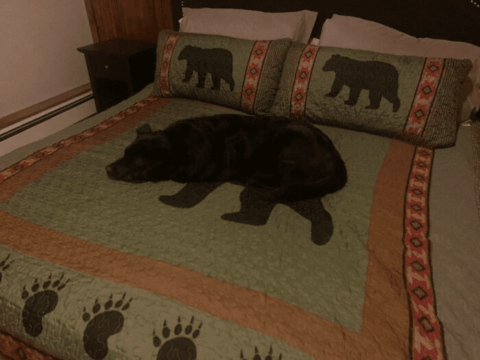A dog resting on a patterned blanket blends in so well that it looks like an entirely new creature—half dog, half design.